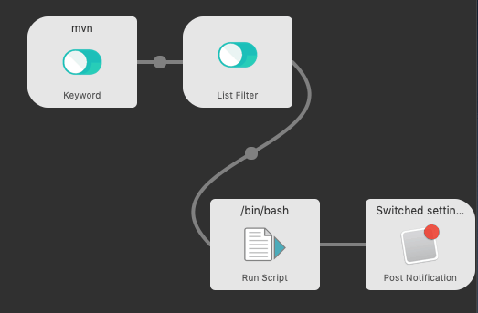 如上,即可实现交互式执行脚本来做切换。但这种方案还是需要每次执行下脚本。 有办法做到一键切换吗?有的!Alfred就可以。