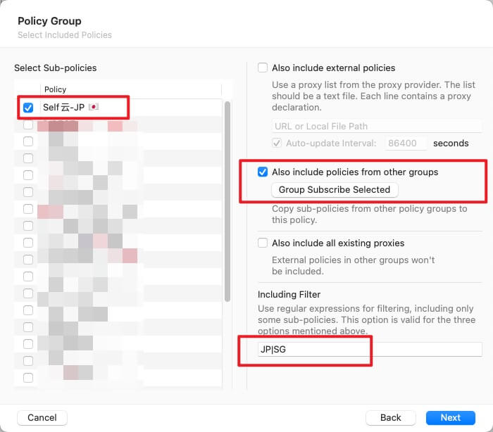 比如我这里看奈飞需要新加坡和日本的节点,那么创建一个手动选择的策略组,勾选包含订阅组的策略,同时手动添加一些节点。但订阅策略组的往往包含了多国家的节点,因此这里我增加了过滤规则。